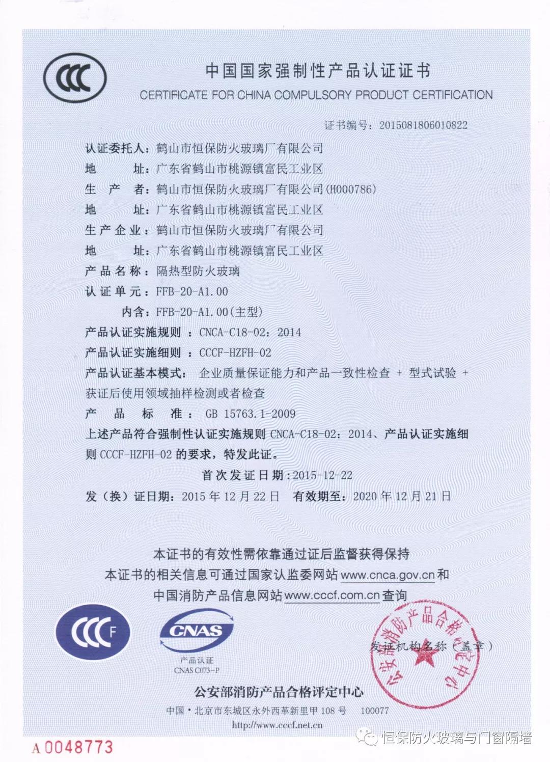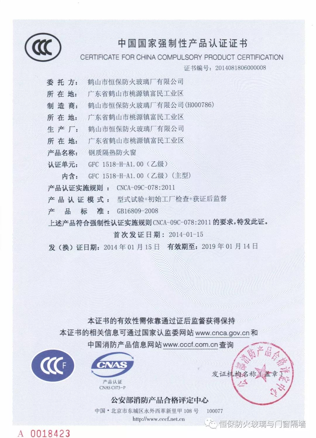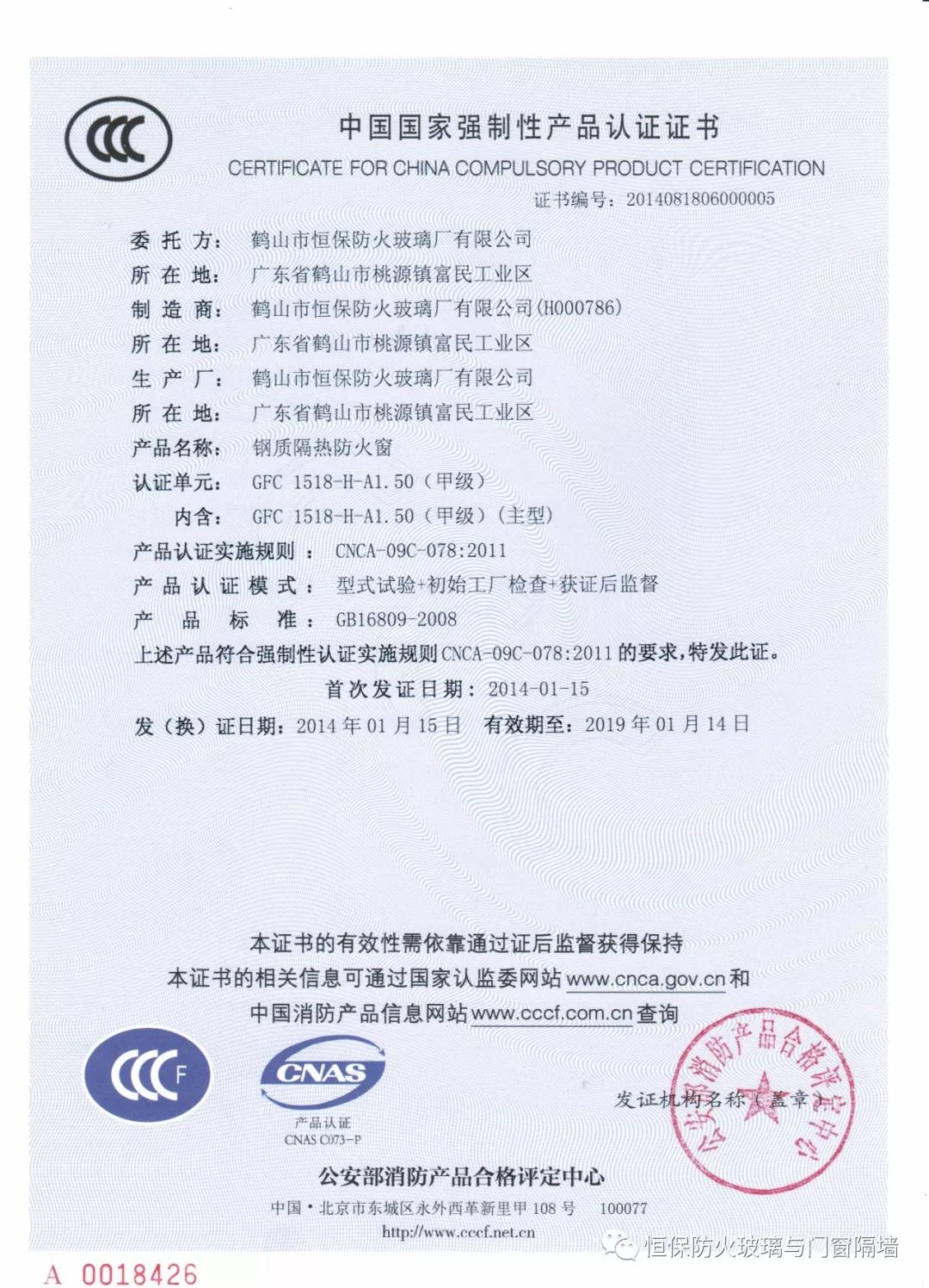 4.恒保公司一共12個產品獲得國家3C認證證書,2小時和3小時鋼質隔熱防火窗更是國家首個通過國家認證的產品;