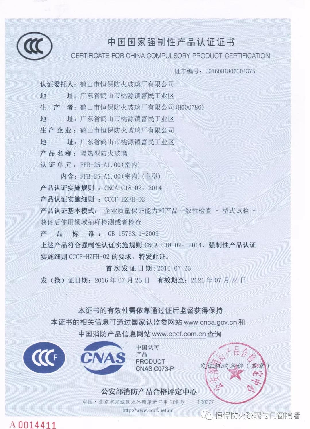 1)防火玻璃:A類隔熱型防火玻璃:需有CCC認證證書和型式試驗報告;C類非隔熱型防火玻璃:只需要提供形式檢驗報告;