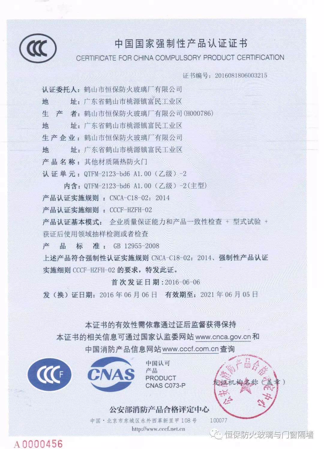 5、恒保公司一共6個產品獲得國家3C認證證書,其中大版面玻璃防火門2100mmX3000mm