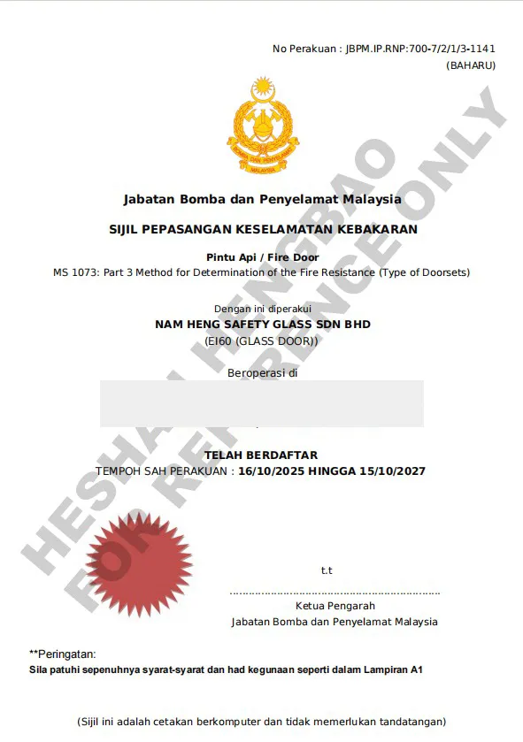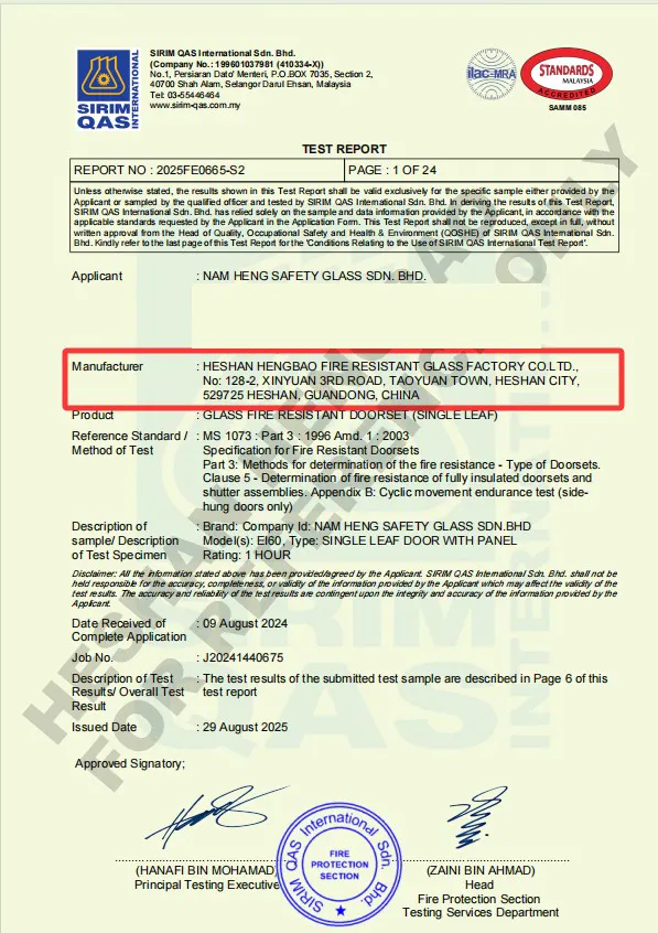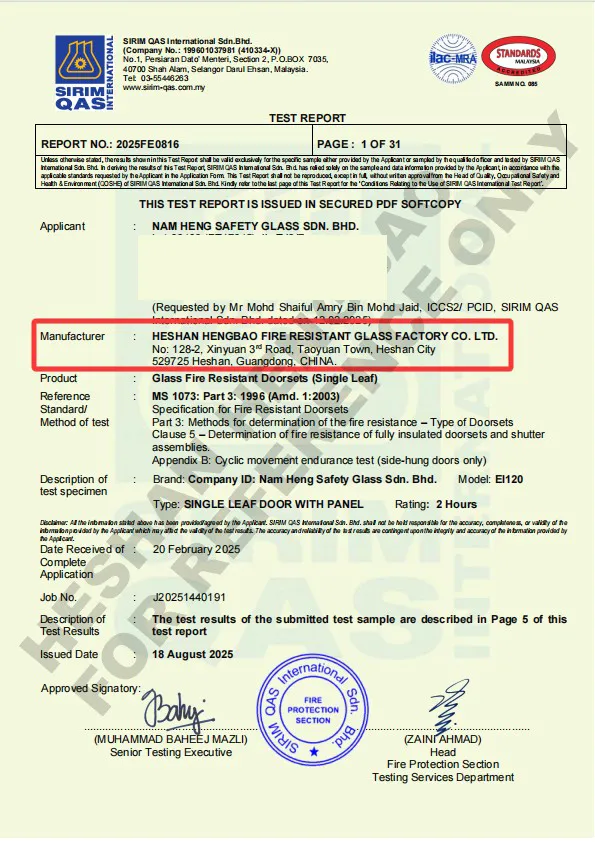 喜訊:恒保與馬來西亞南興玻璃集團(tuán)共同研究開發(fā)EI60和EI120玻璃防火門帶間墻系統(tǒng),并于馬來西亞科技創(chuàng)新與產(chǎn)業(yè)研究院(SIRIM Berhad)順利通過SIRIM認(rèn)證。至此,恒保成為第一個EI120玻璃防火門帶間墻系統(tǒng)產(chǎn)品通過SIRIM認(rèn)證的公司。恒保和南興玻璃集團(tuán)共創(chuàng)輝煌,迎來新的里程碑!